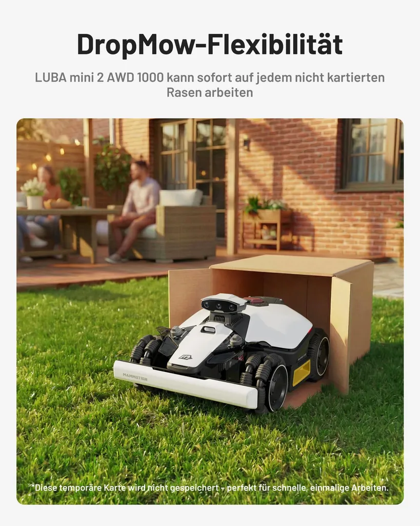 Der Mammotion LUBA Mini 2 AWD 1000 ist ein Premium-Mähroboter ohne Begrenzungskabel mit KI, RTK-Navigation und Allradantrieb. Perfekt für große und anspruchsvolle Gärten. High-End Mähroboter mit Allradantrieb & KI – mäht selbst extreme Gelände mühelos