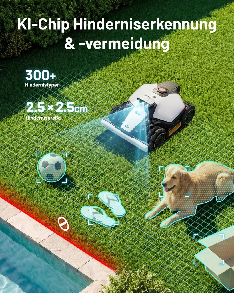 Dank der Kombination aus Triple-Kamera-KI-Vision, NetRTK und leistungsstarkem AI-Chip erreicht der Roboter eine zentimetergenaue Positionierung – selbst unter schwierigen Bedingungen wie Schatten oder Bäumen.
